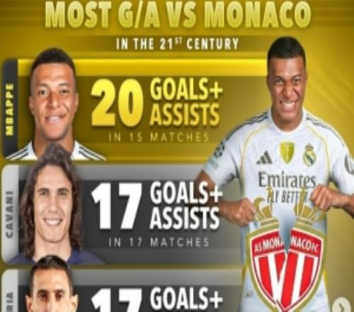 体育播报1月21日宣 在本轮欧冠皇马6-1击败摩纳哥的比赛中,姆巴佩梅开二度。据统计,姆巴佩在面对老东家摩纳哥...